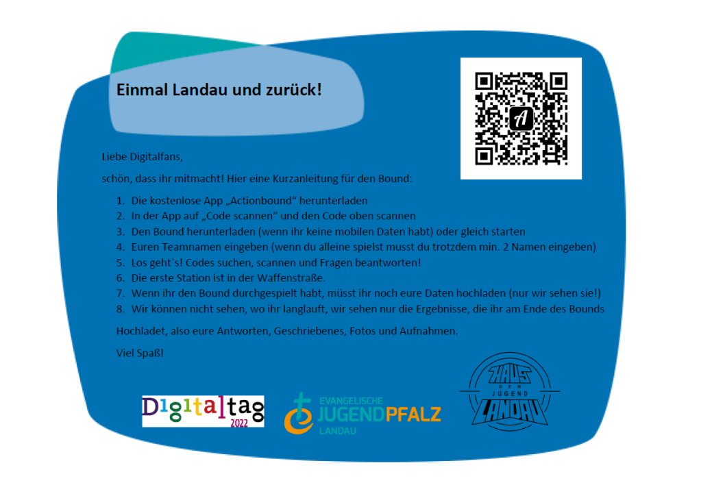 Wir, das Haus der Jugend und die Evangelische Jugendzentrale Landau sind beim dritten bundesweiten Digitaltag am 24. Juni 2022 dabei. Bei unserem Actionbound „Einmal Landau und zurück“ dreht sich alles um die digitale Schnitzeljagd! Bei dieser digitalen Schnitzeljagd per App auf dem Smartphone geht es darum, Stationen in der Landauer Innenstadt zu finden. Verschiedene Aufgaben führen an Orte, die für Kinder und Jugendliche in Landau attraktive Locations sind um sich Unterstützung zu holen oder seine Freizeit dort zu verbringen. Wer bis zum Ende durchkommt, hat nicht nur viele spannende Fakten zu den unterschiedlichsten Anlaufstellen für Kinder und Jugendliche erfahren, sondern kann auch ab dem 28.07.2022 zu den Öffnungszeiten des Haus der Jugend vorbeischauen und sich seine Kennenlern-Paket abholen. Die Aktion richtet sich an Kinder und Jugendliche ab 10 Jahre. Kinder unter 12 sollten in Begleitung eines Erwachsenen unterwegs sind. Wir freuen uns darüber, mit Euch gemeinsam Digitalisierung zu erleben!
